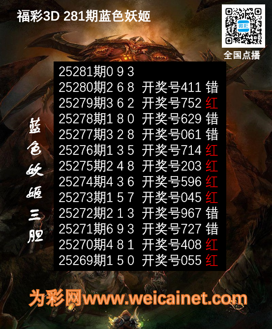福彩3D25281期胆码 蓝色妖姬胆码图