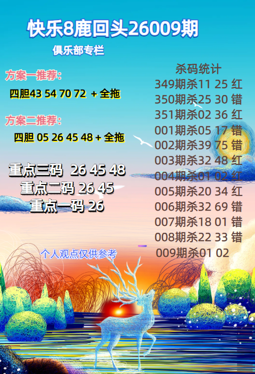 快乐8 26009期鹿回头杀码统计图! 发表于:2026-01-09 18:43:39 浏览次数:0 上一篇:26009期:积极向上福彩3D试机号后网红推荐 下一篇:快乐8 26009期柳树胆码推荐图谜! 推荐文章