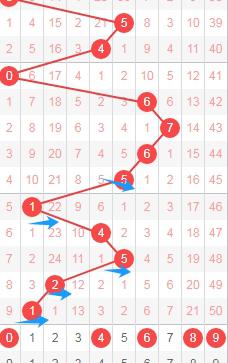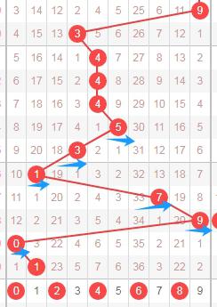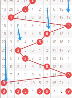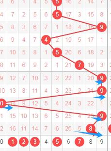 上图是体彩排列五从左到右定位第四位数字走势图,我在上面标注出来的数字都是遗漏周期小的数字023569,标准出来的蓝色箭头表示遗漏周期,上期开出数字0遗漏周期是24期,那么本期出遗漏周期小的数字机会是有的,关注数字023569,个人最看好数字2369。