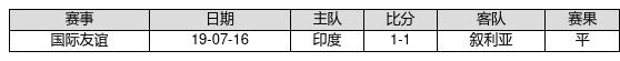 叙利亚 VS 印度两队近10年的交战次数为1场,叙利亚0胜1平0负,赢球概率为0%,平局概率为100%,输球概率为0%。