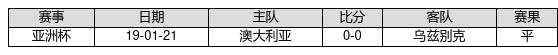 澳大利亚 VS 乌兹别克两队近10年的交战次数为1场,澳大利亚0胜1平0负,赢球概率为0%,平局概率为100%,输球概率为0%。