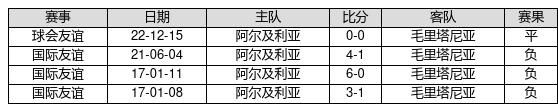毛里塔尼亚 VS 阿尔及利亚两队近10年的交战次数为4场,毛里塔尼亚0胜1平3负,赢球概率为0%,平局概率为25%,输球概率为75%。