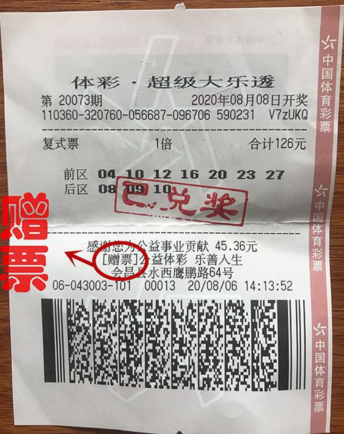 原来,8月5日傍晚,文先生像往常一样来到会昌县水西鹰鹏路的3606043003体彩门店,正打算要买自己精选的7+2复式号码。“最近我们在开展大乐透1000万元赠票活动,6+3、7+3、8+3都能参与,买就送,中了还能送”,代销者聂冬娇推荐了大乐透活动,他当时觉得还不错,就果断买了一注7+3 复式票。当晚体彩大乐透20072期开奖,文先生这注复式票中了3+1。8月6日,文先生来到体彩门店兑奖,除了兑得常规奖金外,再次获得了一张随机打出号码的7+3的赠票。
