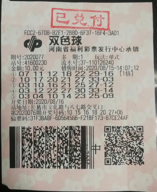 2020年8月16日晚,中国福利彩票双色球2020077期开奖,开出红球号码为:03、10、16、21、25、27,蓝球号码为12,当期全国共中出一等奖27注,单注奖金584万元,分落河北、山西、浙江、重庆、河南、湖北、广东、广西八地,其中仅河南一省中出11注,成为当期最大的赢家。数据显示,河南11注头奖,花落7地市,郑州4注、安阳2注、开封1注、新乡1注、许昌1注、周口1注、驻马店1注。