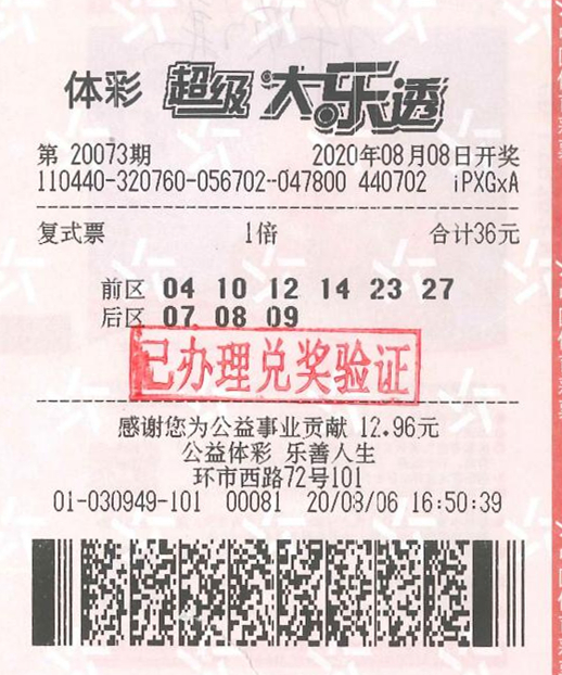 8月8日,体彩大乐透第20073期开奖,前区开出号码04、10、12、23、27,后区开出号码08、09。当期全国共中出7注一等奖,其中6注为基本,单注奖金974万元;1注为追加,单注奖金1753万元。位于广州市荔湾区环市西路72号的4401030949实体店中出1注基本一等奖,由于中奖的彩票是一张6+3的复式单,这名幸运的购彩者同时还中得2注二等奖及多注小奖,揽获总奖金994万多元。