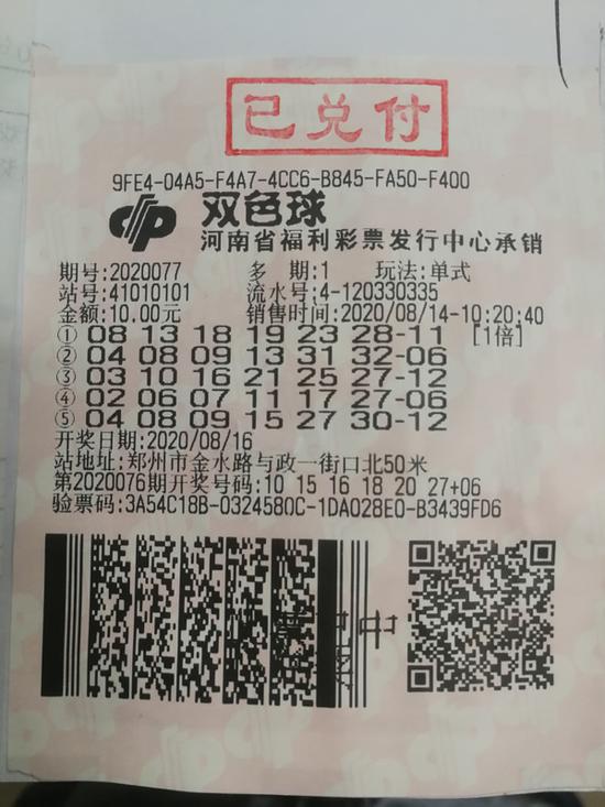 2020年8月16日晚,中国福利彩票双色球2020077期开奖,开出红球号码为:03、10、16、21、25、27,蓝球号码为12,当期全国共中出一等奖27注,单注奖金584万元,分落河北、山西、浙江、重庆、河南、湖北、广东、广西八地,其中仅河南一省中出11注,成为当期最大的赢家。数据显示,河南11注头奖,花落7地市,郑州4注、安阳2注、开封1注、新乡1注、许昌1注、周口1注、驻马店1注。