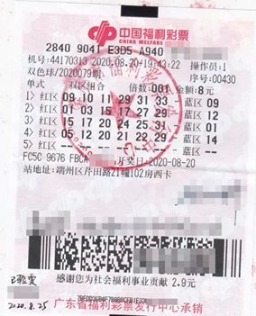 8月20日,肇庆彩民凭借一张8元4注的单式自选票,中得双色球一等奖,斩获奖金857万元奖金。8月25日上午,何阿姨(化名)在丈夫的陪同下,现身肇庆市福彩中心办理兑奖验票手续,她表示从知道自己中奖至今一直睡不好,心情一直都兴奋,等到现在心情稍微平复了才过来兑奖。