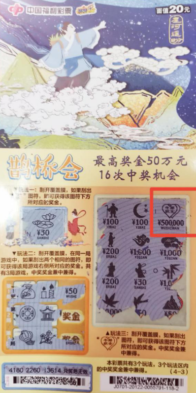 最后,小编要特别提醒大家的是,山东省福利彩票发行中心开展的“鹊桥会”营销活动正在火热进行中,彩票购买者购买刮刮乐新游戏 “鹊桥会”,单张彩票中30元再获赠面值70元的即开票,100万元即开票送完为止。如果您现在已经跃跃欲试,不妨走进身边的福彩销售站,来一张“鹊桥会”,说不定下一个大奖幸运儿就是你!