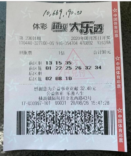 8月26日,体彩超级大乐透第20081期开奖。前区开出01、13、15、32、35,后区开出08、10。东莞一位购彩者喜中1注一等奖,奖金1000万元。27日,中奖者黎先生带着太太高高兴兴地来到东莞市体育彩票管理中心兑奖。