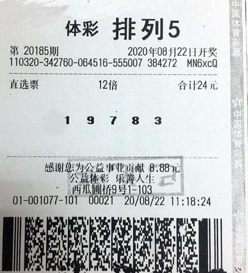 李先生领奖时出示的中奖彩票是一张单式票,锁定号码“19783”,倍投12倍。8月22日晚,排列5第20185期开出的中奖号码正是“19783”,李先生一举中得12注一等奖,单注奖金10万元,总奖金120万元。