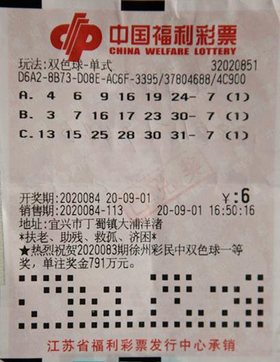 9月1日晚,拥有“彩市航母”美誉的中国福利彩票双色球游戏进行第2020084期开奖。当期我省彩民喜中1注一等奖,来自于无锡市。该幸运彩民对3注单式票进行了复制操作,花费6元,其中的第2注号码与当期的中奖号码完全一致,共计中得一等奖1注、六等奖2注,奖金总额564万多元。幸运站点是宜兴市丁蜀镇大浦洋渚、编号32020851福彩站,出票日期是9月1日16时50分16秒。