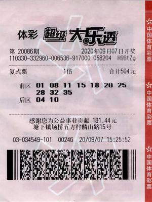 9月7日,大乐透第20086期开奖,全国中出一等奖6注,每注奖金1000万元,其中一注花落浙江温州瑞安塘下镇场桥五方村麟山路15号的3303034549体彩实体店,中奖票为“10+2”复式票。收获一等奖1注以及其他奖级若干,单票奖金1009万余元。