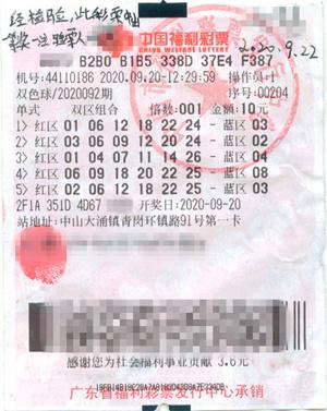 9月20日晚,双色球第2020092期开奖,开奖号码为红球:01、06、12、18、22、24,蓝球:03。当期,全国共开出6注一等奖,单注奖金为832万元。广东省中出1注一等奖,这注大奖花落中山,出自位于大涌镇青岗环镇路91号第一卡的44110186福彩站,中奖彩票为一张10元5注号码的自选单式彩票,这也是中山彩民今年中出的第五个500万元以上福彩大奖!
