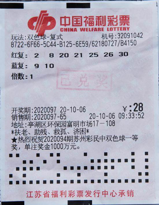 10月6日晚,中国福利彩票双色球游戏进行第2020097期开奖。当期双色球红球号码为02、08、21、25、26、30,蓝球号码为10。当期我省幸运彩民分享了2注一等奖,他们分别来自无锡市和盐城市。其中一位彩民来自盐城市,幸运站点是盐城市亭湖区环保园富明市场17-108,编号32091042的福彩站出票时间为:2020年10月6日9时33分52秒。这是一张自选1注的蓝球复式票,共花费28元。该彩民除了中出1注一等奖,还中出1注二等奖、6注三等奖、6注四等奖,共收获奖金554万元多。
