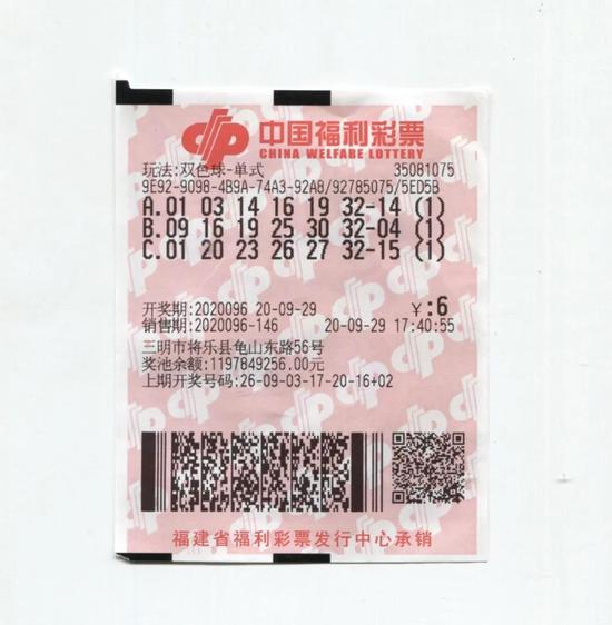 1996年的一个记不得时节的早晨,一位有些话痨的销售员,一张彩票,邓先生(化姓)开启了将近24年的购彩之旅,眼下这趟旅途似乎来到了一个停靠站。9月29日晚,中国福利彩票双色球游戏第2020096期开奖,开出8注超值一等奖,单注奖金为819万元。其中1注出自三明市将乐县龟山东路56号的福彩35081075站,中奖彩票是一张有3注号码的机选单式票,票面上的第3注号码击中当期全部开奖号码。而这一张彩票的所有人正是邓先生。