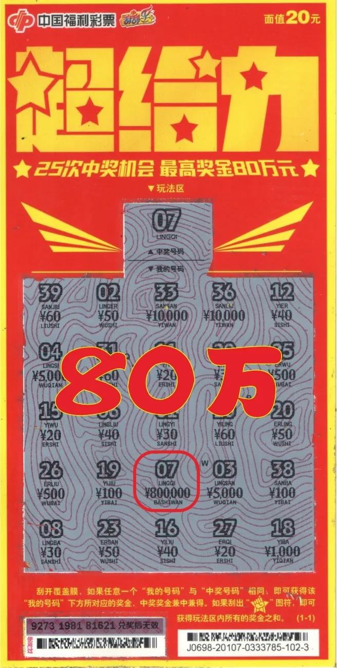 一本面值20元的“超给力”彩票共有25张,小庄开始一张张地刮。当刮开倒数第3张的时候,只见“中奖号码”是“07”,而“我的号码”第4排中间的数字也是“07”,再往下刮开中奖金额,竟然是80万!这下,小庄高兴坏了。他说,他很少买彩票,以前只买过两三次刮刮乐,刮一两张消遣而已,这次是突然之间很想继续刮下去,没想到能中这么大的奖!