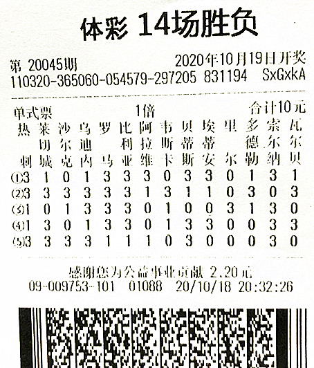 老玩家擒足彩头奖360万 第2次中完成梅开二度
