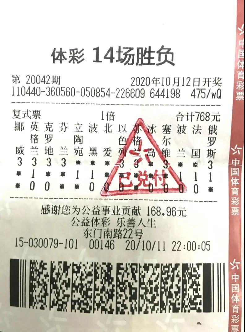 在第20042期足彩14场胜负彩,全国共中出10注一等奖,单注奖金为109万多元,中出344注二等奖,单注奖金为1.36万多元。其中阳江市中出1注一等奖和9注二等奖,全部落在市区东门南路22号的体彩销售实体店,为同一个购彩者所中,总奖金为122万多元。