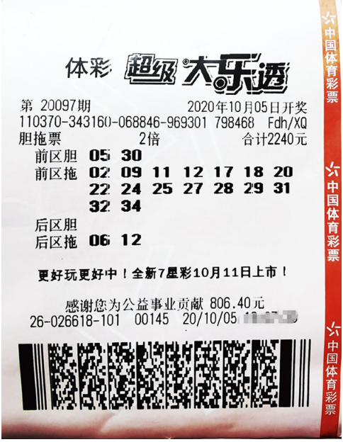 据了解,幸运大奖获得者D先生购彩是一位体彩的老朋友,购彩多年对体彩有着浓浓的情感,体彩各游戏玩法几乎均有涉猎,尤其喜欢购买大盘玩法大乐透,几乎每期都会买上几注。10月5日,D先生像往常一样,来到体彩站,因当天恰巧是大乐透开奖日,他先选定了自己心仪的一注号码进行了200倍倍投。之后在选号期间,D先生和店内的购彩者交流选号心得时,感觉几位购彩者的分析挺有道理,自己突然灵光一现:何不把这些购彩者口中的号码结合在一起,以最有眼缘的几个号作胆,购买一张大乐透胆拖票?于是D先生经过筛选之后,用前区的“05、30”和后区的“06、12”作胆,以胆拖加倍投的方式购买了一张2240元的大乐透彩票。等到当期大乐透开奖结果公布后,D先生惊喜地发现自己购买的彩票把所有的中奖号码都囊括其中,并且由于这张彩票是2倍,一张彩票中出2注头奖,总奖金更是惊人地达到了1662万元之多!