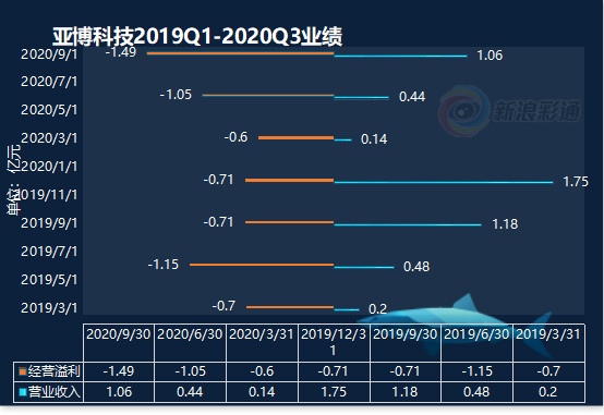 11月10日主营彩票业务的港股上市公司亚博科技控股(简称“亚博科技”)发布2020年第三季度财报,2020年前9个月业绩,实现收益约1.06亿港元,相较2019年同期减少约10.2%;期内亏损约1.57亿港元,同比增加约114.6%。