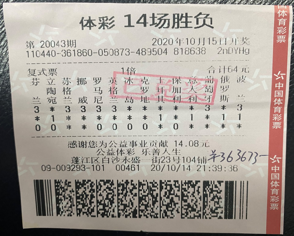男子64元小单中足彩36万:***中这么多很开心