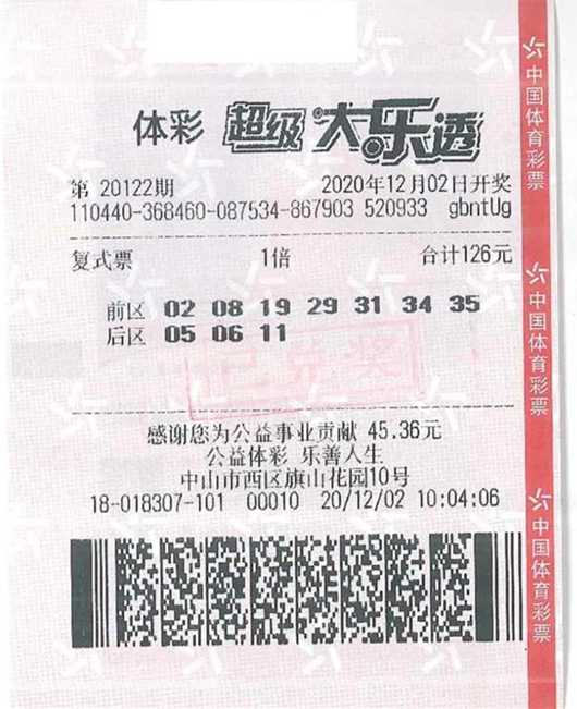 大乐透第20122期于12月2日开奖,前区开出号码“08、19、29、34、35”,后区开出号码“06、11”。当期全国一等奖共计10注,其中1注花落中山。