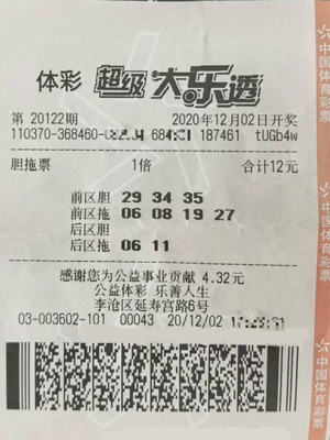 12月2日下午,李大爷像往常一样来到彩票站,研究了一会儿走势图,前区选择了“29、34、35”3个胆码和“06、08、19、27”3个拖码,后区选择了“06、11”2个号码,组成了一张12元小复式票。购完票后李大爷就回家吃晚饭了。