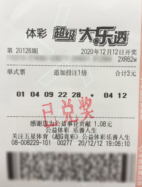 在体彩的诸多玩法中,曹先生更倾心于超级大乐透,基本期期不落,金额控制在20元左右。经验丰富的曹先生表示,自己并不喜欢一张票子打很贵,更喜欢拆开下单,这样成本投入也不高,中奖概率反而提高了点。就好比20126这期其实他买了好几张3元单式票,他的想法是广撒网,多张票一起围猎奖池,最终凭借“前区01、04、09、22、28,后区04、12”这张单式追加票杀出重围擒下当期头奖,其余的几张票也收获了不少小奖。对于择号的秘笈,曹先生表示是看了近30期大乐透的开奖号码自行选择的,并没有什么特殊含义,最终开奖号码和自己选择的号码完全对上,主要还是依靠运气,自己并不属于技术型高手,今后会继续支持体彩公益事业,对于奖金计划会用于购置房产。