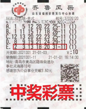 2021年1月3日,双色球第2021001期开奖,山东喜迎头彩,中出1注双色球一等奖,中得大奖的幸运儿就是肖先生。他凭借一张额为10元的5注机选单式票,幸运中出1注一等奖和4注六等奖,中奖金额合计7034126元!
