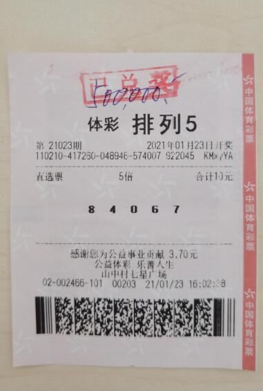 1月23日,体彩排列5第21023期开奖,当期全国开出一等奖58注。大连一位幸运儿命中当期一等奖5注,单注奖金10万元,奖金合计50万元。