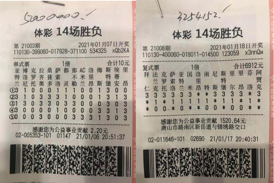 2021年1月7日,足球胜负彩第21003期开奖,其中14场一等奖全国共中出4注,单注奖金500万元,幸运的是有2注落地唐山。好事成双,间隔4期后,1月18日,足球胜负彩第21008期开奖,14场一等奖全国共中出14注,单注奖金300万余元。而这14注一等奖中,又有一注落地唐山。