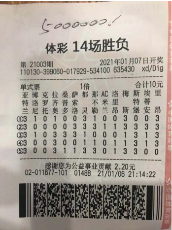 两位大奖得主都酷爱足球,有空时便会一起研究足球赛事,两位最爱购买的彩票还是传统足球14场,这次中得两次一等奖的大奖得主,购买足彩已经3年左右了,主要已传足为主,但对竞彩玩法也十分偏爱,每次购彩金额根据情况在几百元或者几千元不等。而他这次中得百万大奖也并非第一次,早在前两年自己就中得过一次百万大奖!而当问及另一位500万大奖得主时,他说道:“只要有比赛每期都会一些,金额在几百元不等,买彩票主要是以娱乐为主,是调节生活压力的一种方式,没想这次到却轻松中得500万大奖。