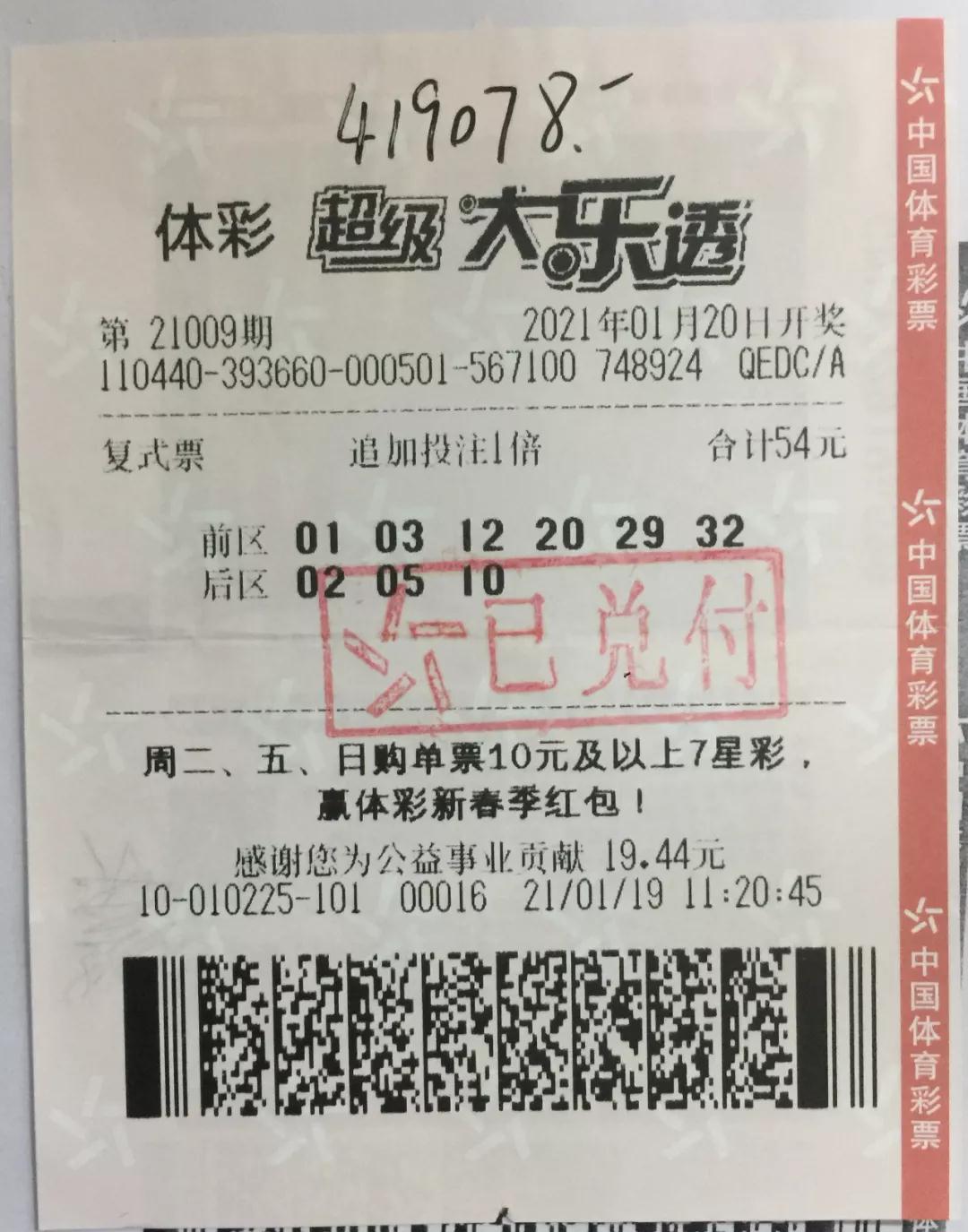 大乐透第21009期开奖,前区号码为“01、03、20、29、32”,后区号码为“05、12”。当期全国中出103注二等奖,单注奖金112661元,其中41注为追加,每注多得奖金9.01万元。追加后,二等奖单注总奖金为20.27万元。