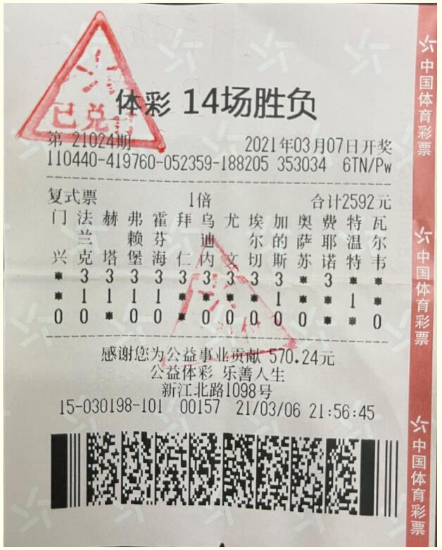 3月7日,第21024期足彩14场胜负彩开奖,当期全国共中出56注一等奖,单注奖金82万多元;中出1914注二等奖,单注奖金6045元。其中1注一等奖和12注二等奖落在阳江市江城区新江北路1098号体彩投注站,为一购彩者独中,收获89万多元的总奖金,为当地贡献税收164272.8元。