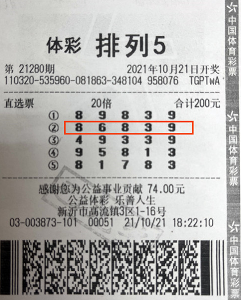 林先生带来的中奖彩票是一张5注号码的单式票,进行了20倍投。该票第2注号码与当期排列5开奖号码完全一致,中得20注一等奖,总奖金200万元。林先生介绍说,他是体彩的忠实粉丝,彩龄超过10年,平时最喜欢的就是体彩小盘玩法排列3和排列5。有空的时候,林先生经常研究一下近期的开奖号码,然后自选号投注,21280期的这张中奖票就是林先生自选的。当晚的开奖公告出来后,林先生发现自己中了20注一等奖,非常高兴。
