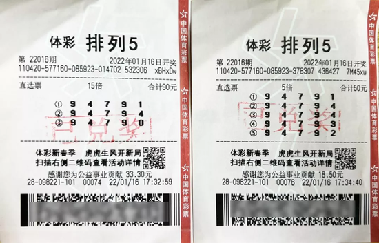 1月16日晚,体彩排列5第22016期开奖号码为“94791”,全国中出65注大奖,其中湖北省恩施98221体彩销售点中得20注,奖金共计200万元。