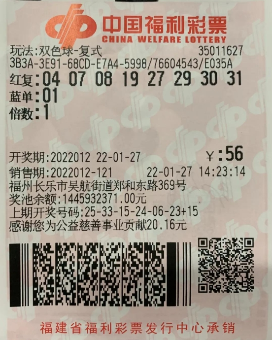 1月27日晚,双色球第2022012期开奖,这是双色球在牛年的最后一期开奖,当期全国中出一等奖9注,单注奖金为730万多元。福建喜获其中1注,花落福州长乐吴航街道郑和东路369号的福彩35011627投注站,中奖彩票是一张投注额为56元的8+1复式票,总奖金达734万元!