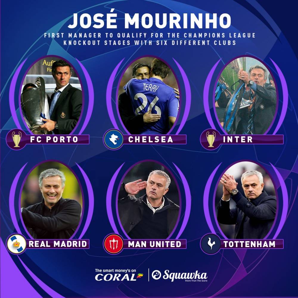 热刺主帅穆里尼奥成为了历史上第一位带领6支球队打进欧冠淘汰赛的主教练。