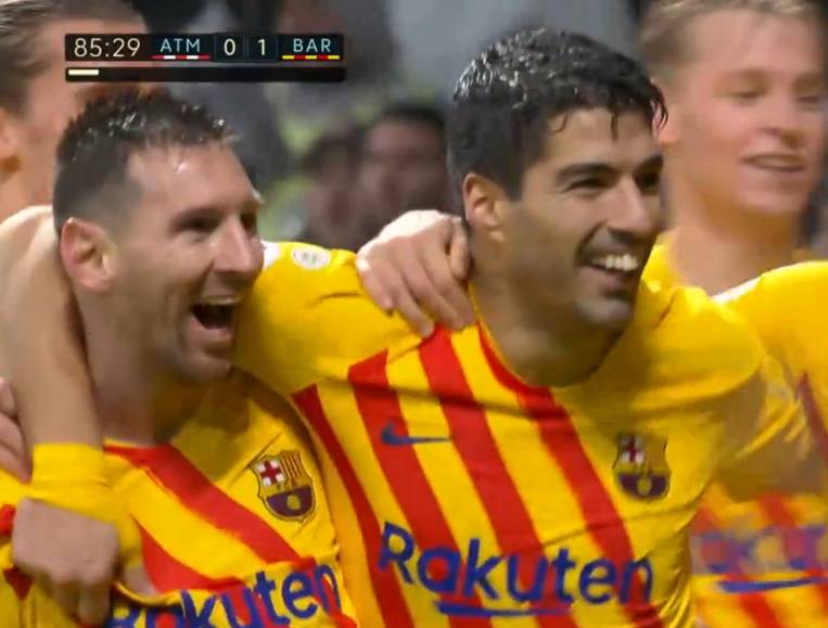 比赛第85分钟,巴萨打破僵局,梅西前场与苏亚雷斯打出撞墙配合后,禁区前沿左脚推射,皮球直入球门死角!巴萨1-0马竞!