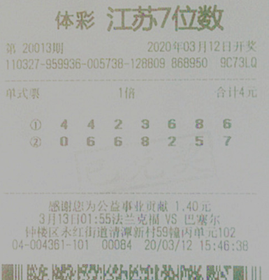 3月11日体彩正式复市,3月12日下午,刘先生便匆匆来到常州3204004361体彩网点,他一是要看看年前买的一些彩票有没有中奖,二是要买几注好久没有投注的7位数过把瘾。按照老规矩,刘先生4元随机投注了当晚开奖的20013期7位数,谁知好运就这样降临了,当晚开奖后,他购买的第一注号码“4423686”正是当期7位数的中奖号码,奖金达到500万,这注大奖同时也是江苏体彩复市开出的首个500万大奖。