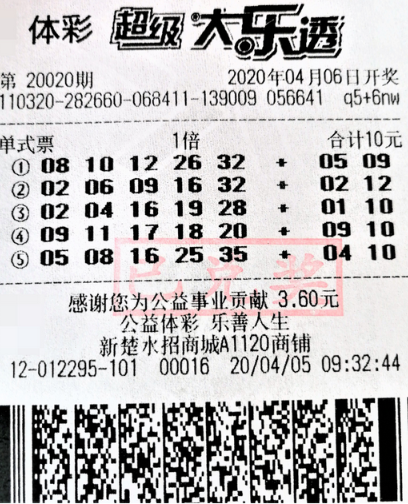 袁先生的中奖票,是一张10元5注的单式票,4月5日9点32分购于泰州3212012295体彩网点。其中,第一注号码“08、10、12、26、32+05、09”,**击中4月6日开奖的第20020期大乐透号码,中得一等奖1注,奖金1000万元。谈及购彩过程,袁先生介绍说,那天他去买东西路过体彩店,顺道进去买起了彩票。起初,他按照习惯看着走势图,精心挑选了几注号码进行投注,然而等到出票后,反倒越看越不满意。于是,索性又补打了一张机选票。没想到,就是这张机选票,帮助他收获了1000万元大奖。