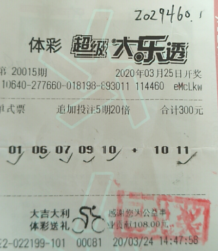 3月30日,体彩超级大乐透第20017期开奖,开奖号码为01、06、07、09、10+02、11。我区中出大乐透追加二等奖20注,奖金合计202.9万元。