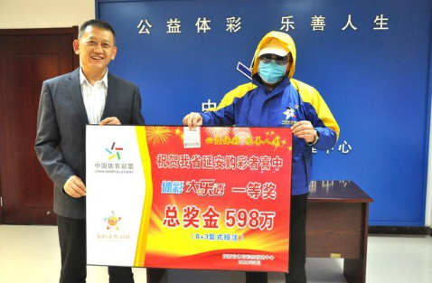 5月4日,体彩大乐透 “9.9亿元大派奖”第三期开奖,第20032期前区开出号码“02、03、09、16、32”,后区开出号码“03、04”。当期为国家筹集彩票公益金1.13亿元。我省咸阳和延安各中出1注大乐透一等奖。5月6日咸阳中奖者刘先生(化姓)到省体彩中心兑奖,延安的中奖者却迟迟未现身领奖,就在大家纷纷猜测中奖彩票是不是丢了,中奖者是不是出差到延安的,不知道自己中奖了时,在5月14日,延安这个大乐透一等奖中奖者终于现身省体彩中心兑奖了,省体彩中心副主任王红年为他颁奖,并送上祝福。