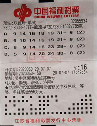 7月7日晚,中国福利彩票双色球游戏进行第2020060期开奖,开出的双色球红球号码为05,09,14,20,24,30,蓝球号码为08。当期共井喷头奖38注,单注奖金为523万多元。这38注一等奖花落20地,被北京、上海、江苏、安徽、广东等地彩民分享。我省2注头奖均被来自苏州同一位彩民斩获。该彩民2倍投注了4组自选号码,仅花费16元,中得一等奖2注、六等奖2注,奖金总额达1047万多元。诞出大奖的幸运站点是苏州市吴中区郭巷彩虹路86号32055934福彩投注站;出票时间为2020年7月7日17时42分34秒。