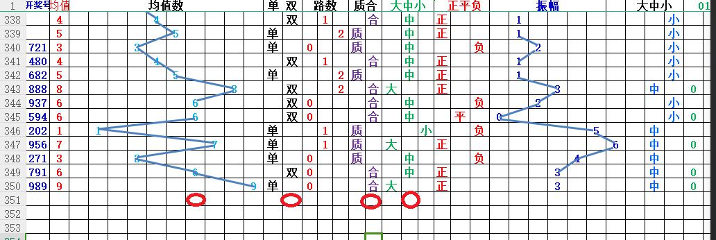 均值:就是开奖号每各数的总和除3,然后得到的余数,如果不够整除可以+1,-1,直到被整除得的数就是均值