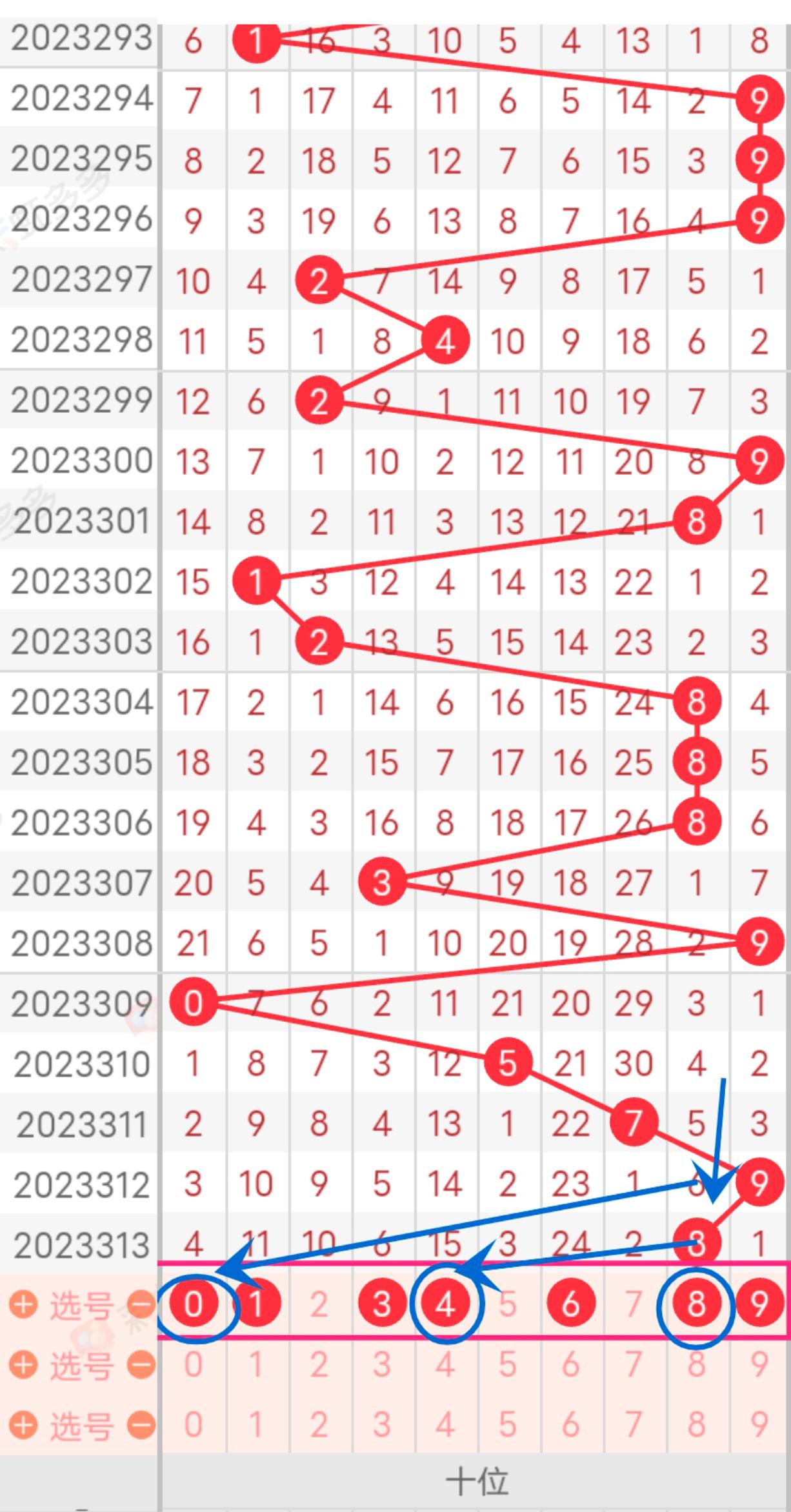 十位在上期开出了偶数“8”,大小形态为“大”。通过观察十位“8”百期内的下期开奖号码有:“0、1、3、4、6、8、9”如图所示,十位在上期开出折线走势形态,跨距振幅为小。根据近期的走势形态以及跨距振幅分析,本期可考虑预防小跨距振幅的号码,根据走势形态来分析,本期可考虑预防临码连线走势形态第二的顶边号码“0”。在预选行中符合小跨距振幅的号码有:“4、6、8、9”。由于上期开奖号之前开出了三期奇数号码,则本期可预防偶数号码连续开出。在预选行符合小跨距振幅的偶数高层有:4、6、8三码。十位推荐三码:0、4、8十位推荐二码:0、4十位推荐一码:0个位分析: