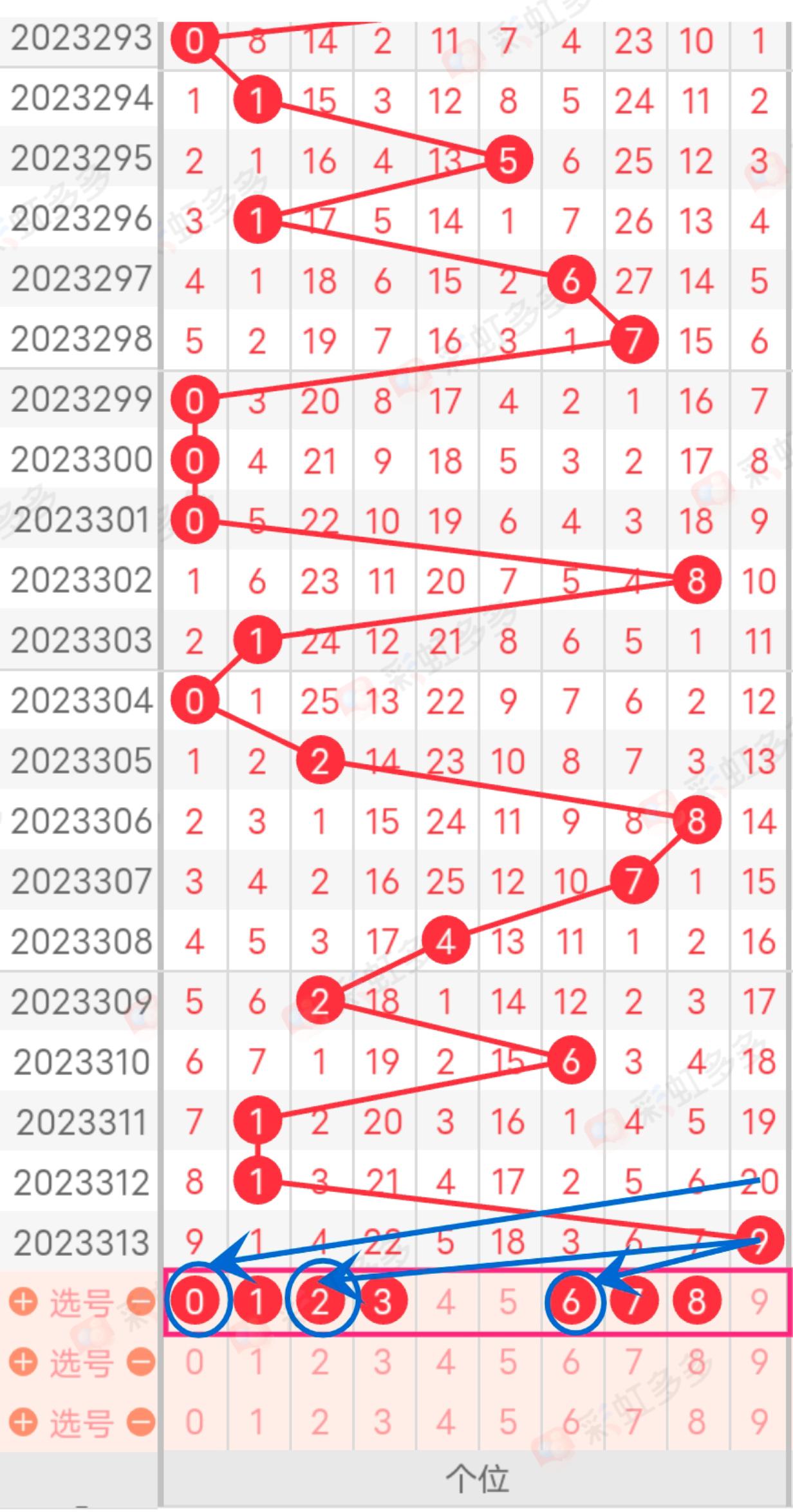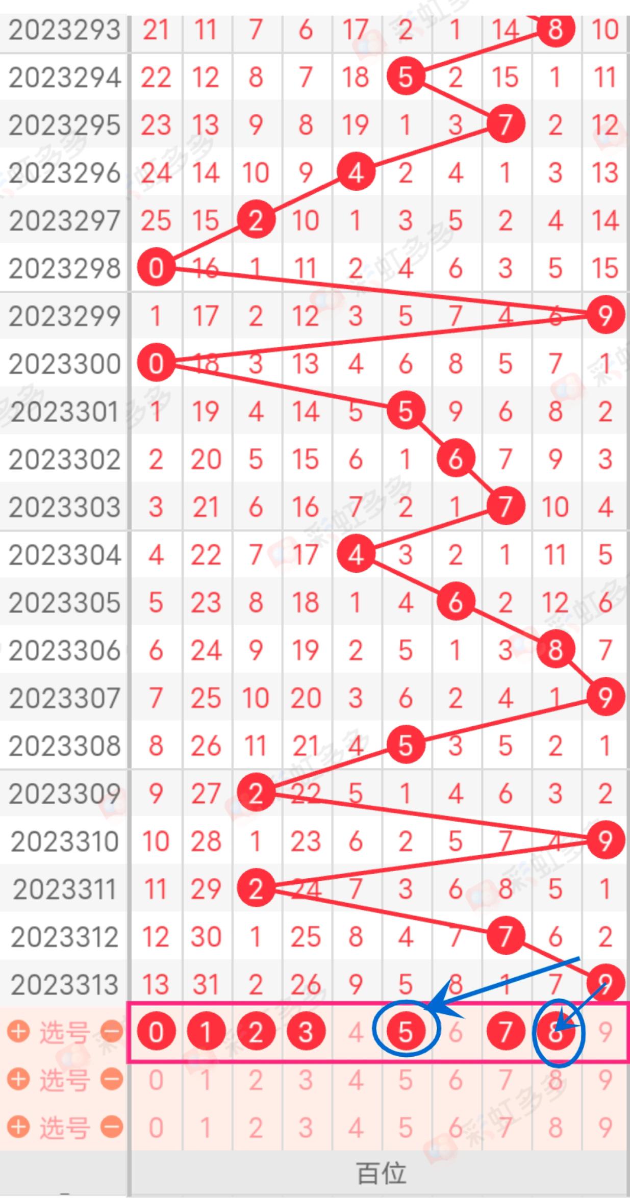 百位在上期开出了奇数“9”,大小形态为“大”。通过观察百位“9”百期内的下期开奖号码有:“0、1、2、3、5、7、9”如图所示,百位在上期开出了连线走势形态,跨距振幅为小。图中可见近期走势形态在开出“V”字走势形态后变更为了连线走势形态,根据这个走势形态分析,本期可考虑预防连续开出连线走势形态,以及连线走势形态后开出折线走势形态。在预选行中符合折线走势形态的热码有一码“2”。其次为连续开出连线走势形态,在预选行中符合连线走势形态第一段的小跨距振幅号码有:5、7、8。百位推荐三码:2、5、8百位推荐两码:8、5百位推荐一码:5十位分析: