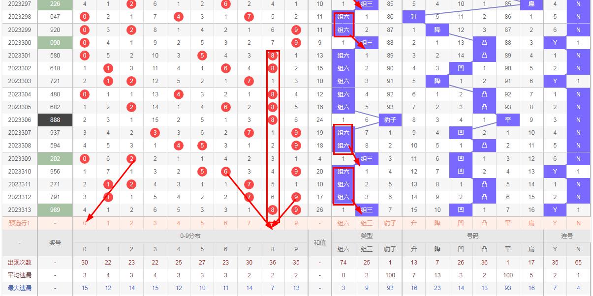 类型分析:以历史100期为例组三和组六的比为25比74一般出3期组六出一期组三现在的数据基本符合求均衡的特点。上期刚出过组三,从图中可以看出组三连出2期的概率很小。所以本期结合类型走势图预判福彩3D第314期形态以组六为主。