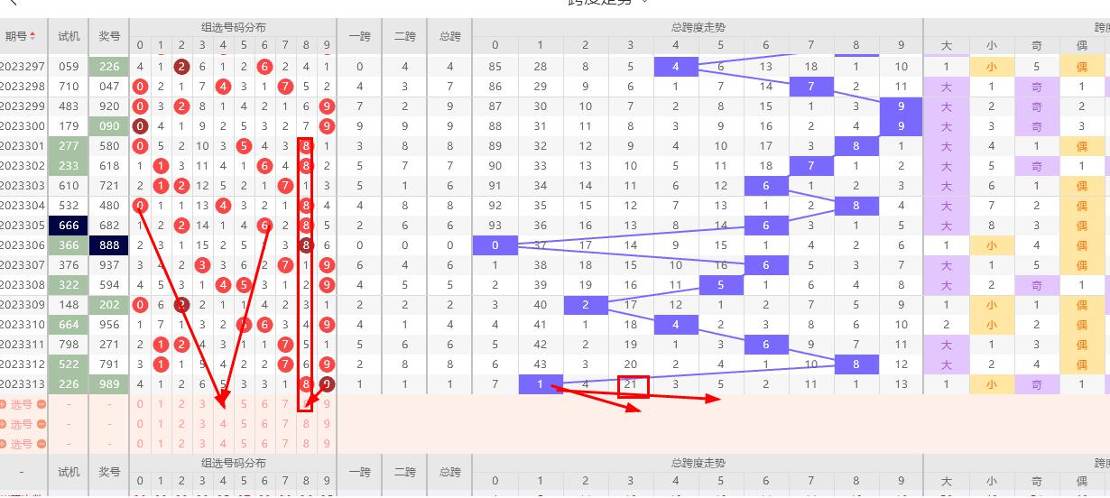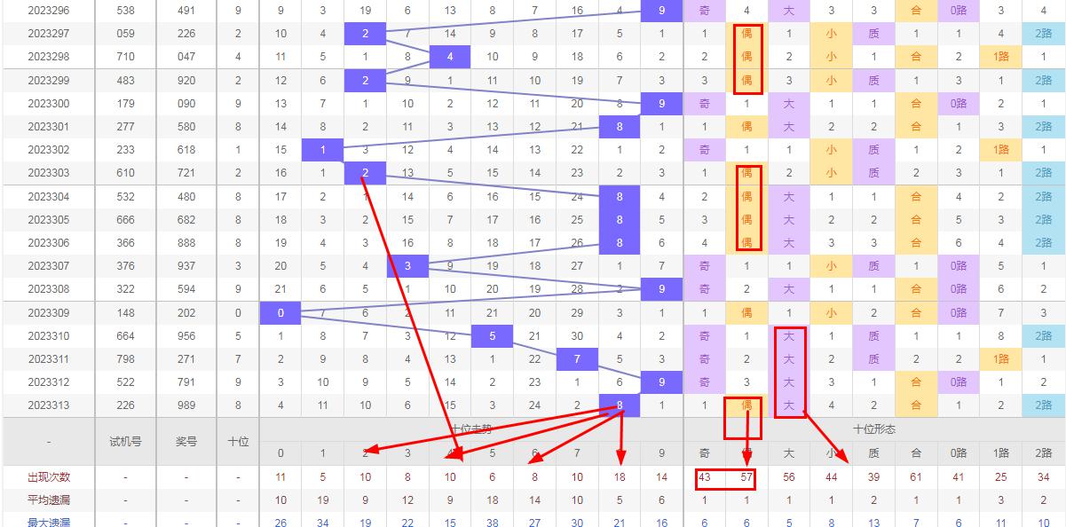 福彩3D十位分析:第313期十位开出号码8属于大数偶数。以历史100期数据为例十位奇偶比43比57大小比为56比44大小奇偶都相处10点左右,根据求均衡的规律开出奇数的概率比偶数高一点。从上图划线出也可以看出奇数1357,100期内出现的次数明显少于其它号码,但经过连续几期的回补后偶数有接力的动作上期开出大偶8就是苗头。通过对十位的振幅走势来看,上期十位走出了小振幅1,和我们上期预判的基本一致,落位号码为大偶球8,那么在对本期号码进行分析时我们可以看出近期在十位落位的号码整体振幅的跨度比较大,但基本在两三个周期就要进行一次调换,那么上期十位号码走出了2个振幅,本期我们在十位做号的时候就比较轻松了,我们本期在十位看好振幅走大在(2-5)个振幅比较合适,那么在号码落位方面我们重点考虑中小号码为宜。所以福彩3D第314期十位推荐2468防守大数奇数7号隔空回补。