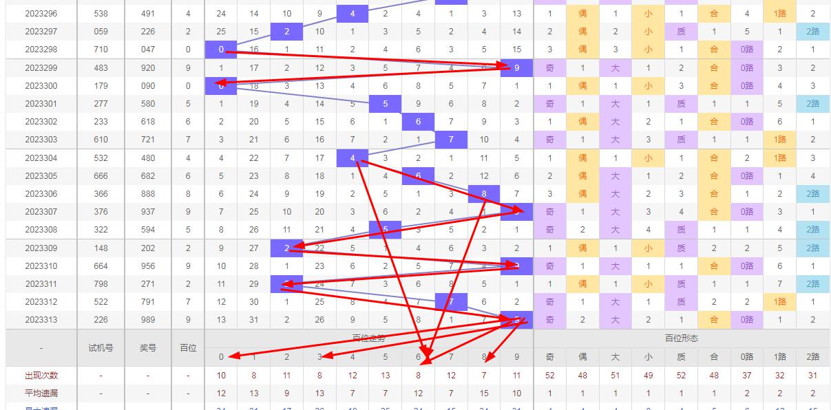 福彩3D百位分析:第313期百位开出号码9归属于大数奇数,从上面百位走势图上可以看出近100期大小比为51:49奇偶比为52:48。数据还是比较均衡的符合文章开头介绍的求均衡规律。但最近20期开出的大数比小数多7个根据求均衡规律应该继续向小数靠拢,上期百位落号“9”号球,在百位号码开出路1号码7后向大侧走出2个振幅。预测与实际落号基本相符说明我们的思路是正确的,那么通过分析上期百位落位号码分析,号码走出2个振幅,号码走大为奇数,开出0路号码。通过对百位落号趋势来分析,百位号码继续落位中端,通过对近20期的走势来看百位号码基本处于中大号码,那么中端连续两期的落码1和6也给我们指明了具体的方向,那么本期我们在对百位号码进行研判时我个人的考虑百位号码会反向走出小号球落码,那么本期我们在百位关注的重点在1346这4个号码球上,但最近百位以连续走出个2个奇数回补均衡格局,预计本期有向偶数数发展的可能,所以福彩3D第314百位推荐以偶数号码为主看好0368,号码6在走势图连接后成阶梯式图形和历史有相似之处比较看好注意防守。